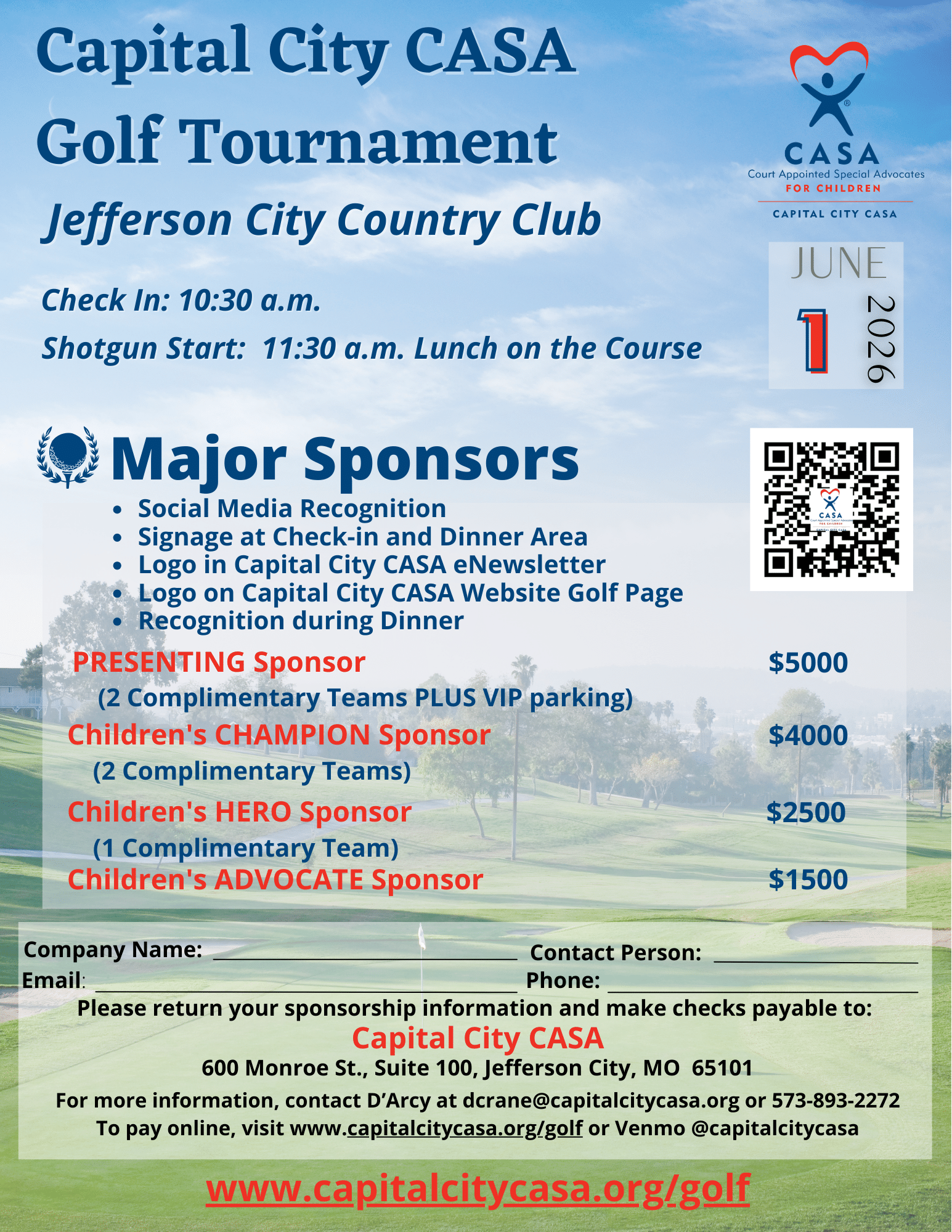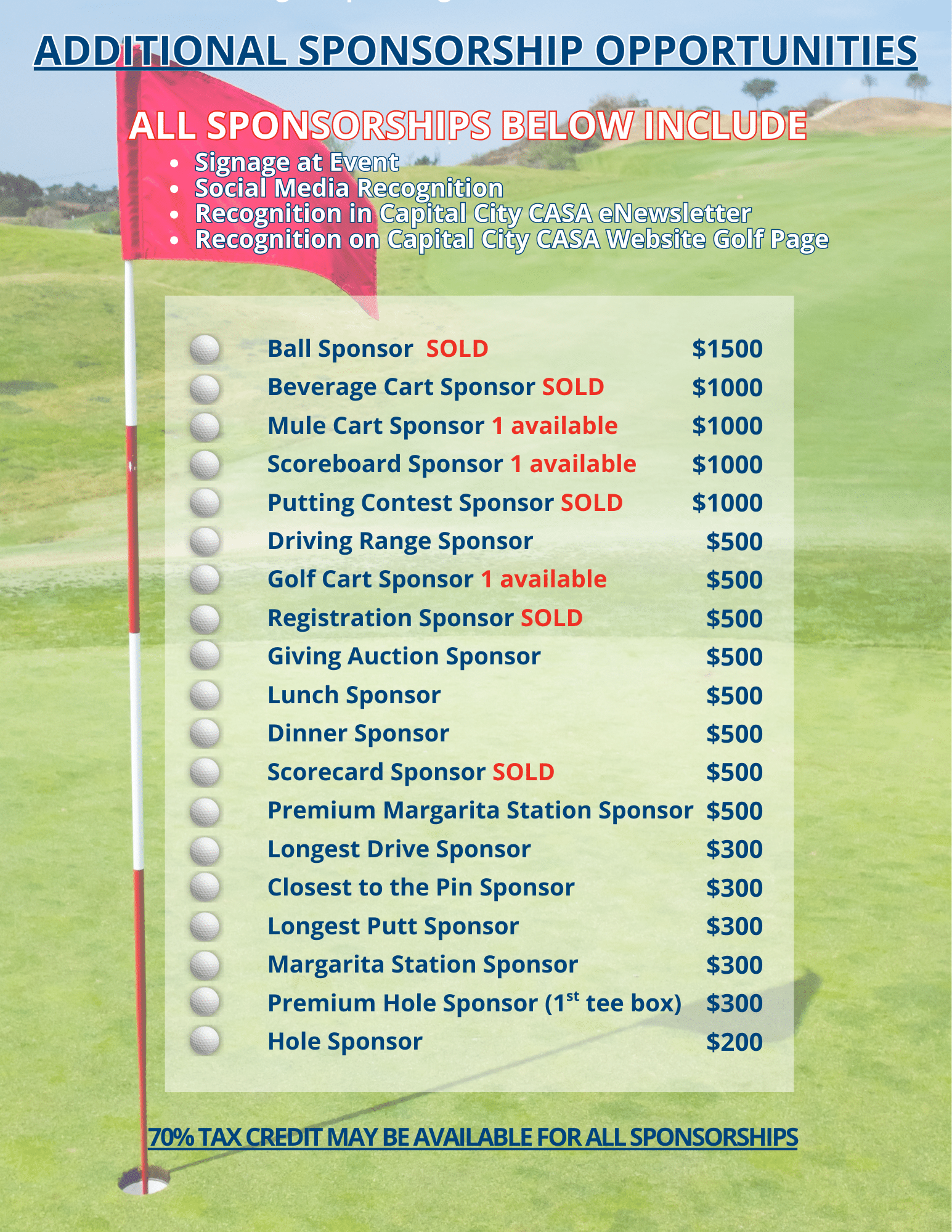 Sponsorship Opportunities Major/Hole Sponsors Additional Sponsorship Opportunities To purchase your sponsorship or register for the tournament, click here.